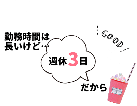 福利厚生もしっかりしていて、一般的な労働基準法の指定以上に休みが多いです。