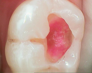 そして染まった部分だけを慎重に削り、虫歯以外の部分を絶対削らないようにしています。少しずつ削って行き、削ったら再びう蝕検知液で虫歯を染め出します。