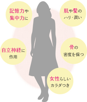 女性らしい身体のラインを作ったり、乳房を発達させたり、骨の量をふやしたり、身体にうるおいをもたらしたりしています。