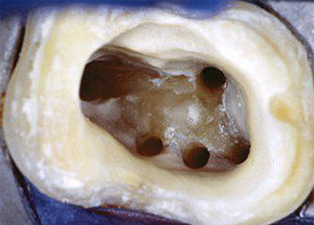 ▲普通は3根管しかない歯なのに、マイクロスコープで見ると5根管ありました。5根管の穴をちゃんと見つけて消毒して、この後薬剤で根管充填しました。